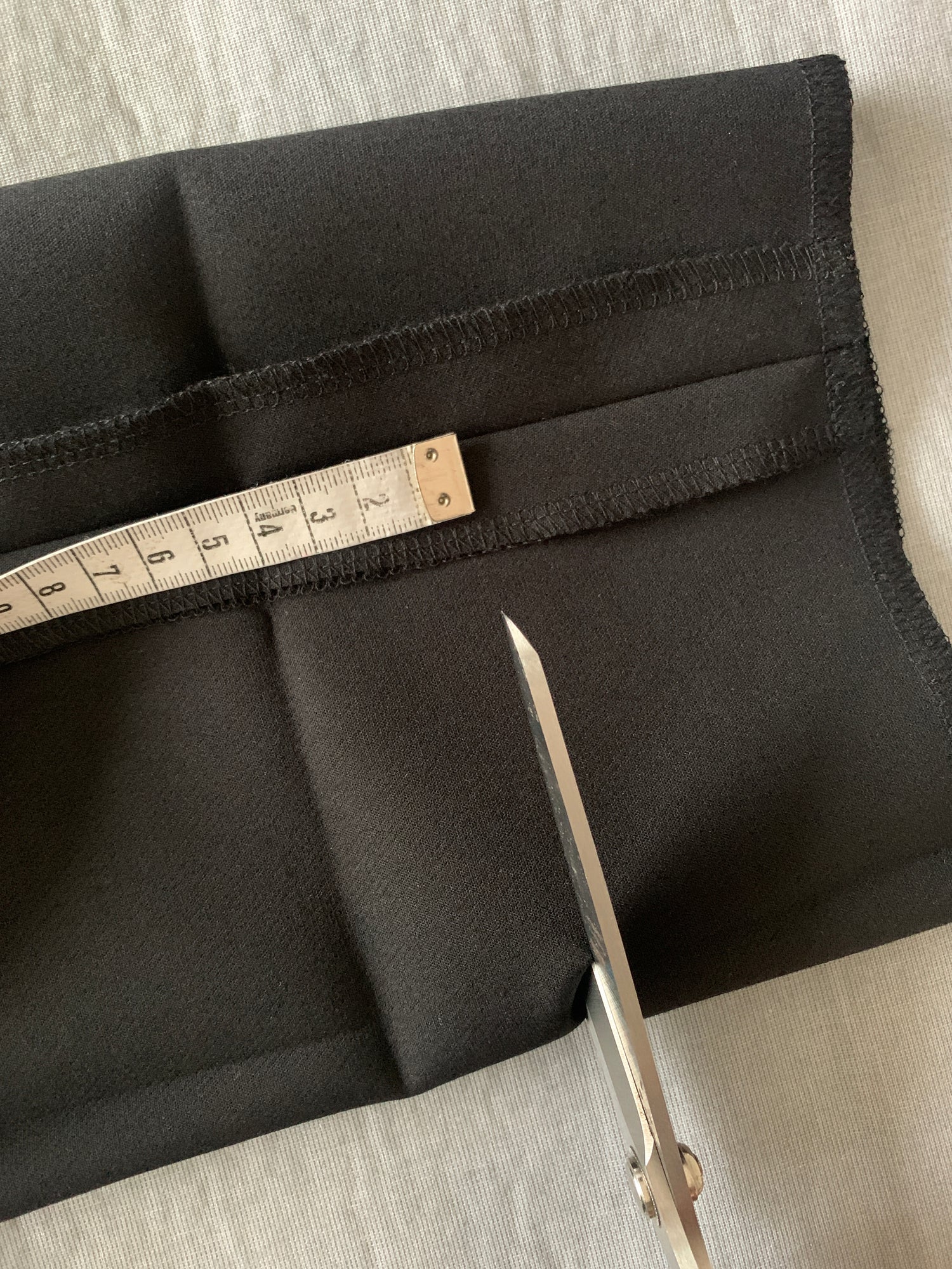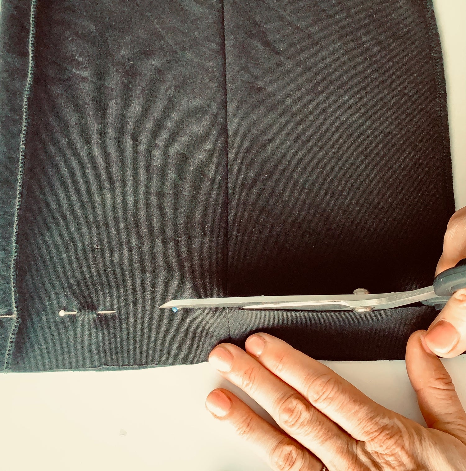 Zorg dat het kledingstuk goed plat en dubbel (op elkaar aangesloten) ligt. Speld de juiste lengte af en knip met een scherpe schaar, langs de lijn van spelden. Ben je in bezit van kleermakerskrijt dan kan je een hulplijn aftekenen.