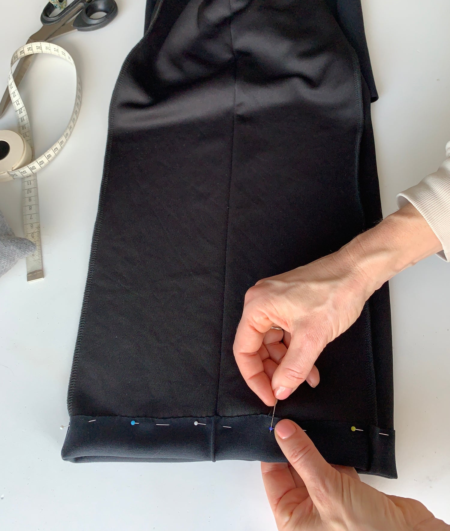 Speld de broek op de gewenste lengte af. Strijk de omslag plat en naai deze vast met de hand, kleine steekjes, of met een blinde steek op de naaimachine. Indien de zoom te lang wordt, deze eerst afknippen en afwerken of naar binnenvouwen.