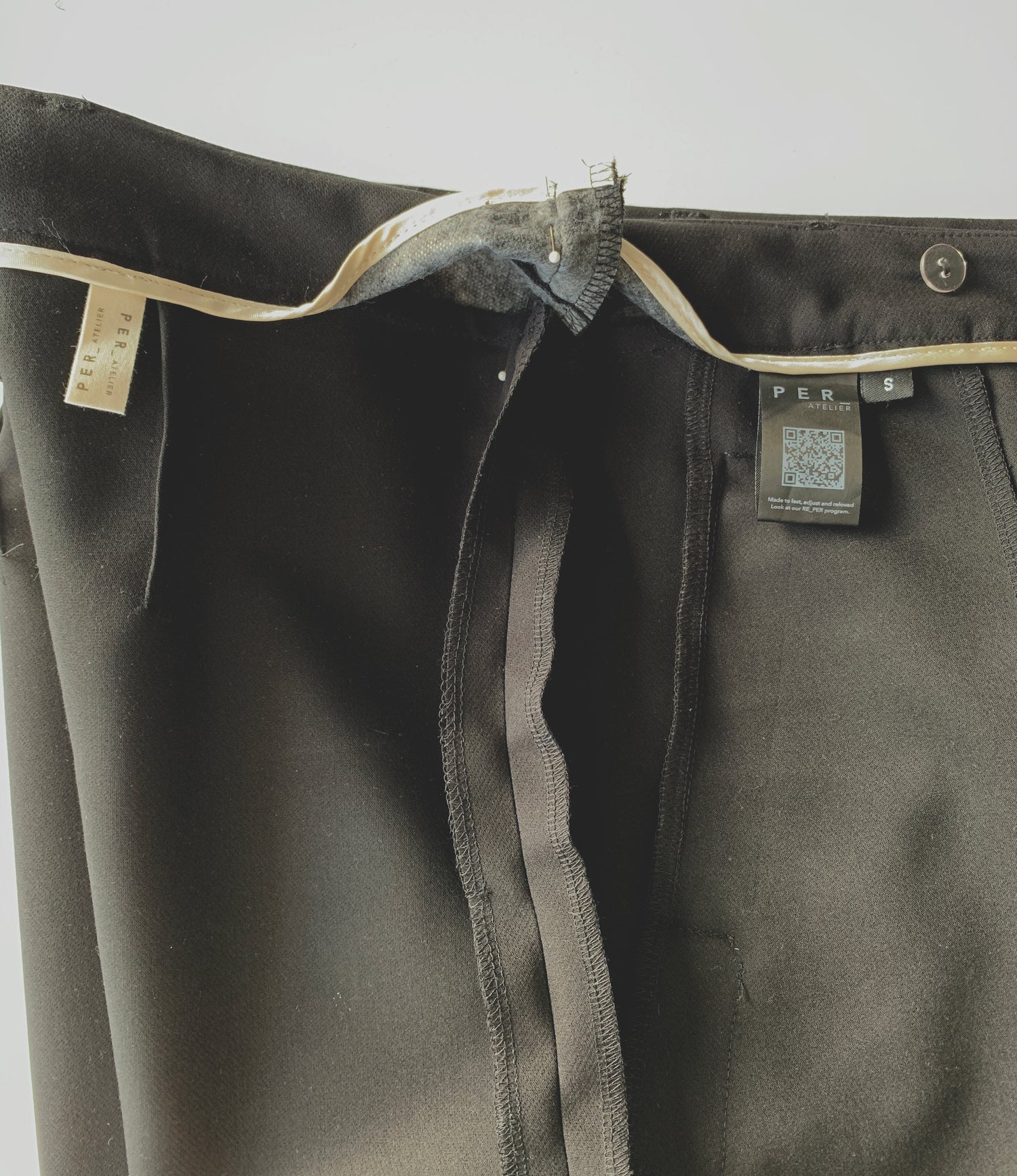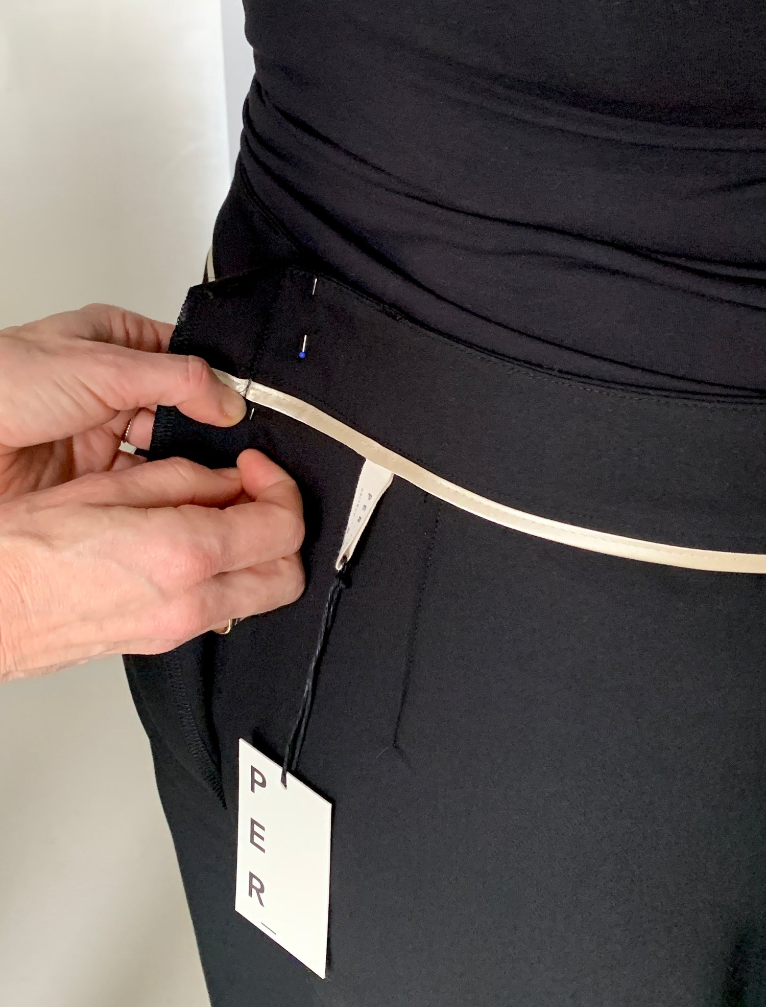 Bij de confectie PER_Pants lopen de zijnaden en de middenachternaad verticaal door in de tailleband. Dit maakt de PER_Pants uniek en aanpasbaar, mede dankzij de extra naadtoeslag. Daarnaast hebben de broeken een extra lange lengte die nog omgezoomd kan worden naar wens.